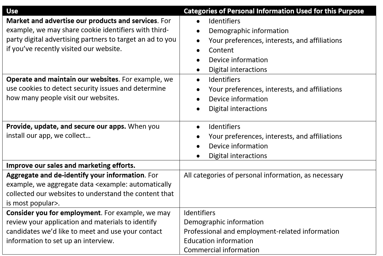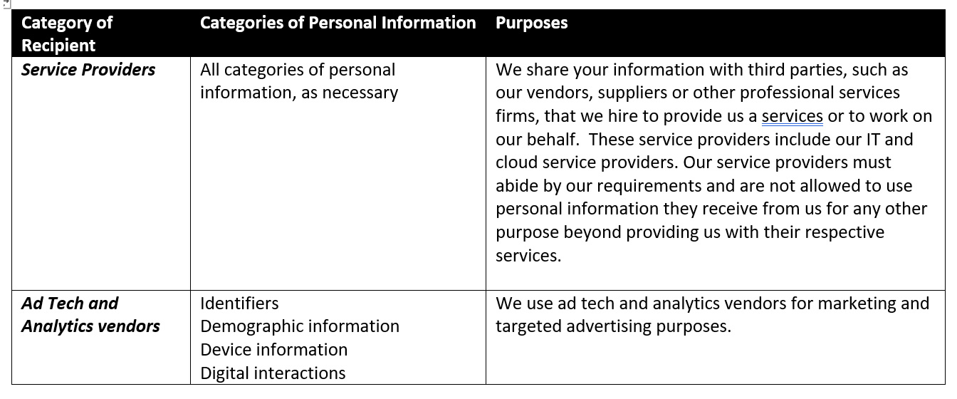 - The categories of personal information shared or disclosed to third parties, the categories of those third parties, as well as the purposes of such sharing or disclosure.