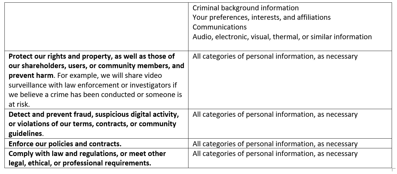 Some of the information we collect, depending on our interactions, may qualify as “sensitive” under certain applicable privacy laws, such as payment card and direct deposit information, sensitive categories of demographic data, criminal background information, and government-issued identifiers. We collect this information as needed to meet our legal obligations, provide our services, enforce our rights, or facilitate the transactions you request.