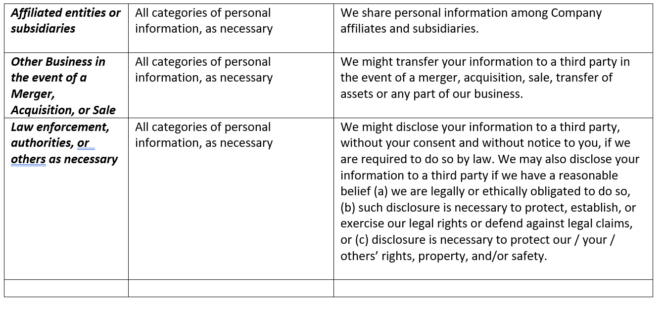We share your information with others in a variety of circumstances. We share with your consent, at your direction, or to complete any transaction or request you have authorized. We also share your information in the as outlined in the chart below. Please see below for more information on the types of third parties we share your information with, the types of personal information shared with those third parties, and why.